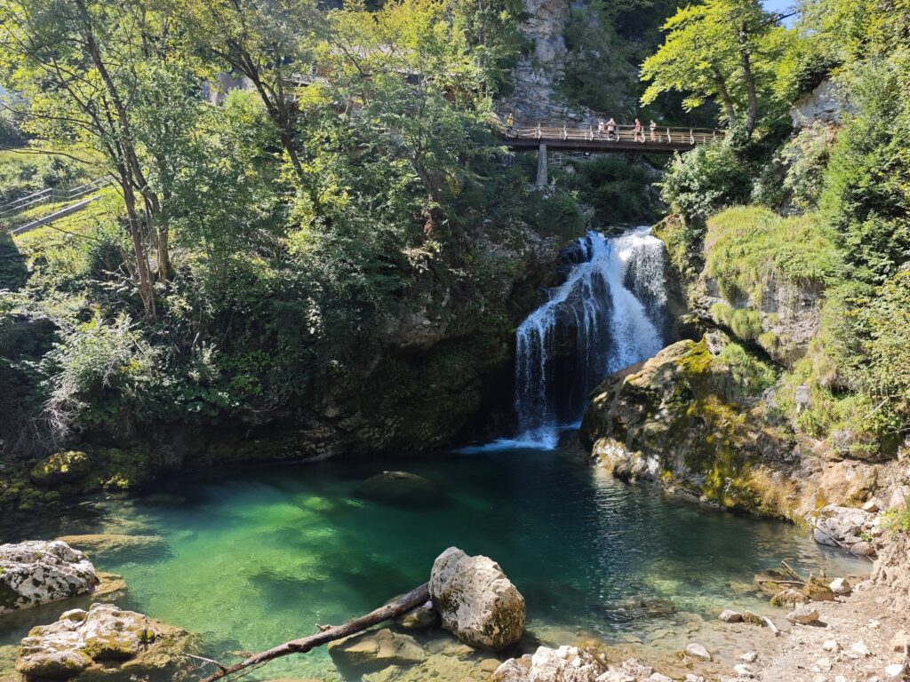 Der Wasserfall befindet sich am östlichen Ende der Vintgar-Klamm. Er markiert den Endpunkt des 1,6 Kilometer langen Lehrpfades durch die Schlucht. Mit einer Fallhöhe von etwa 13 Metern gilt der Šum-Wasserfall als der größte Flusswasserfall Sloweniens. Sein Name “Šum” bedeutet im Slowenischen so viel wie “Lärm” oder “Rauschen” und beschreibt perfekt das kraftvolle Getöse, mit dem die Wassermassen in die Tiefe stürzen. Der Wasserfall war bereits Ende des 19. Jahrhunderts ein beliebtes Ausflugsziel, noch bevor die Vintgar-Klamm selbst für Touristen zugänglich gemacht wurde.